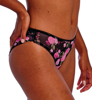 The Freya Rose Blossom Brief Panty (402450) is a feminine and sexy classic brief with mid-rise coverage. The semi-sheer, dark base with contrasting pink roses is complimented by a small rose detail at the center waistband. Picot elastic adorns the waistline, front legs and angled center detail for a delicate touch against this bold print. The rear features a gathered seam for more definition and folded edges to give a flexible but smooth hug on the rear. Pair with Freya Rose Blossom Plunge Underwire Bra (402402), sold separately, for a flirtatious and energetic lingerie set.