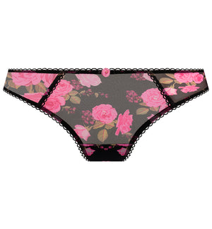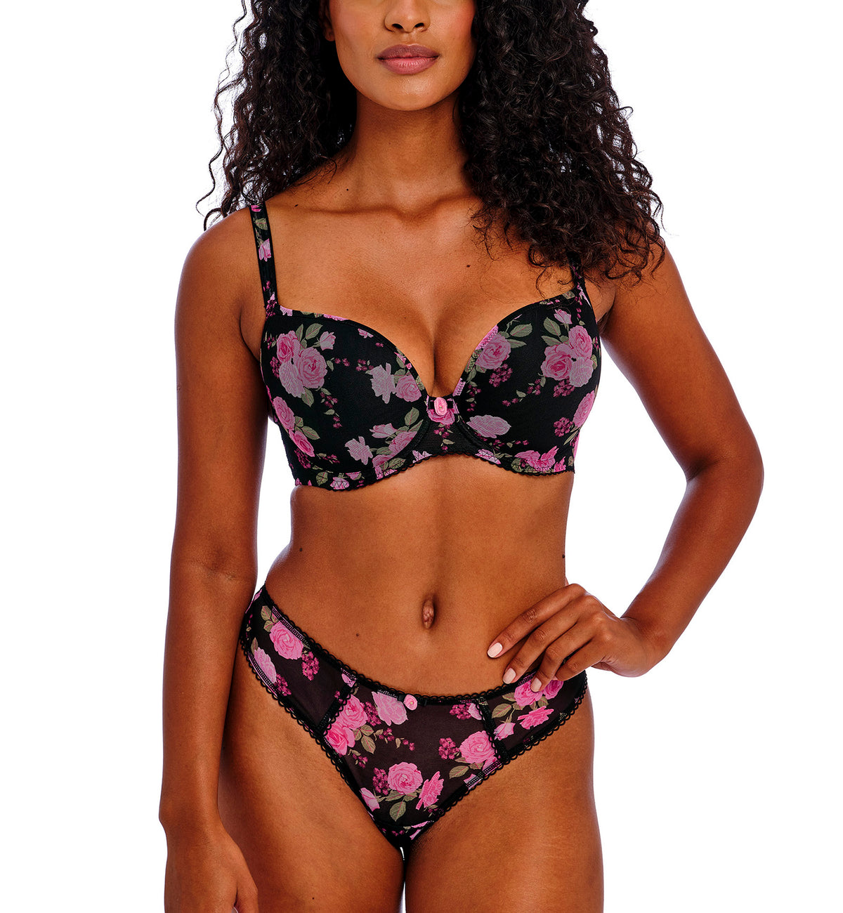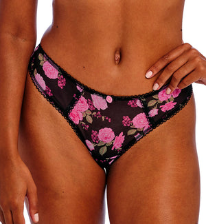 The Freya Rose Blossom Thong (402470) is a feminine and flattering thong with low-rise waist. The semi-sheer, dark base with contrasting pink roses is complimented by a small rose detail at the center waistband. Picot elastic adorns the leg and waist openings for a delicate touch against this bold print. The rear features a fixed lace up detail for a sexy look. Pair with Freya Rose Blossom Plunge Underwire Bra (402402), sold separately, for a flirtatious and energetic lingerie set.