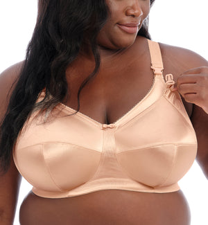Luminous satin shine covers the Goddess Keira Softcup Nursing Bra (6092). Close-set straps wont slip from your shoulders, and the easy to reach, one-hand nursing clasp allows you to quickly and comfortably nurse your hungry baby. The cups close securely and let your bust confidently glow while this satiny plus sized nursing bra gives you a natural profile. The soft and stretchy wide band ensures you get plenty of support and lift without the hassle or discomfort of an underwire. Extremely comfortable and accommodating to fuller busts, this full figured nursing bra shapes to your changing body without irritating sensitive skin.