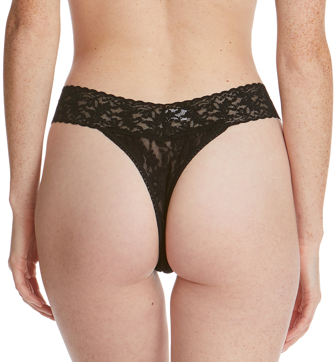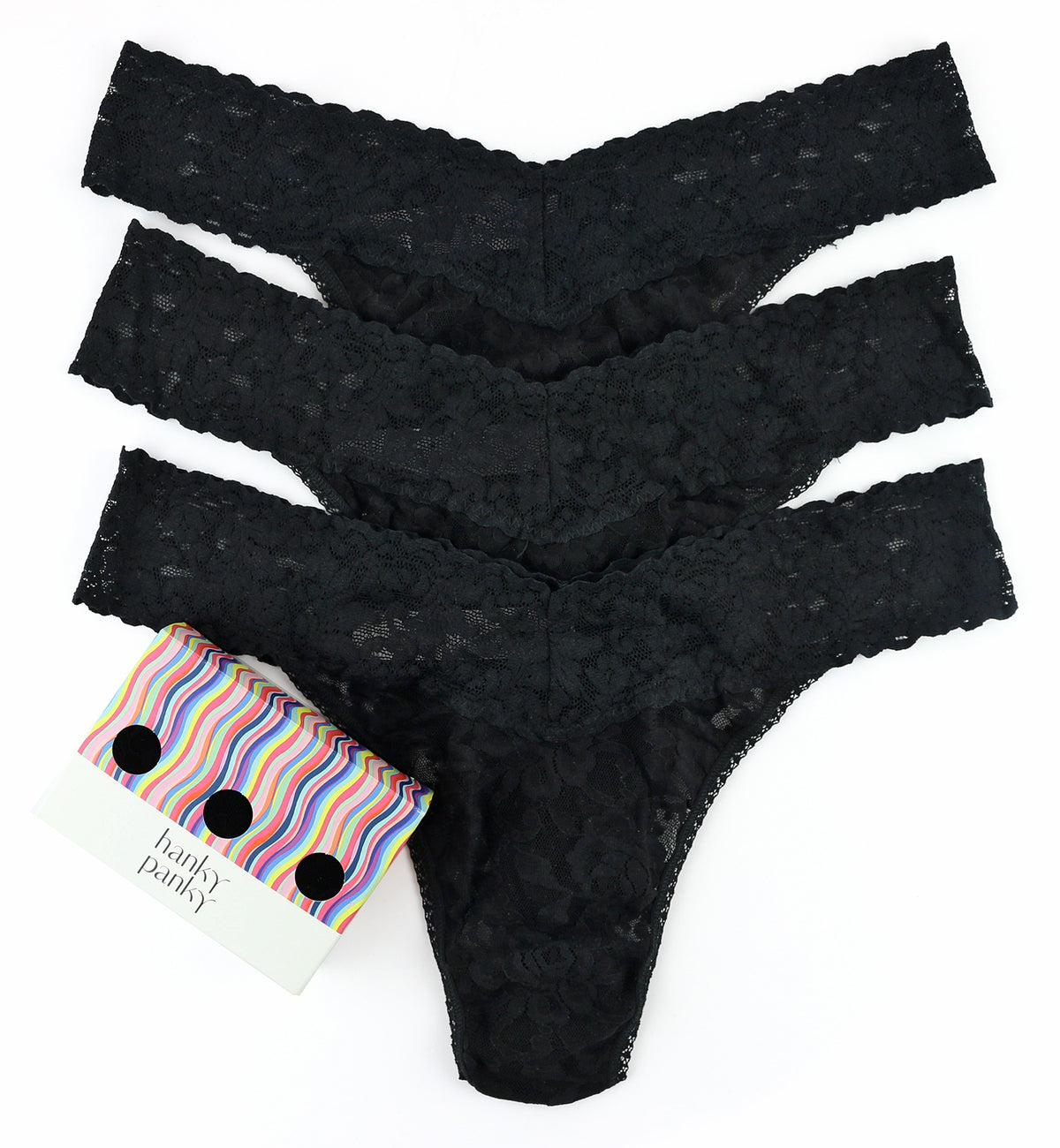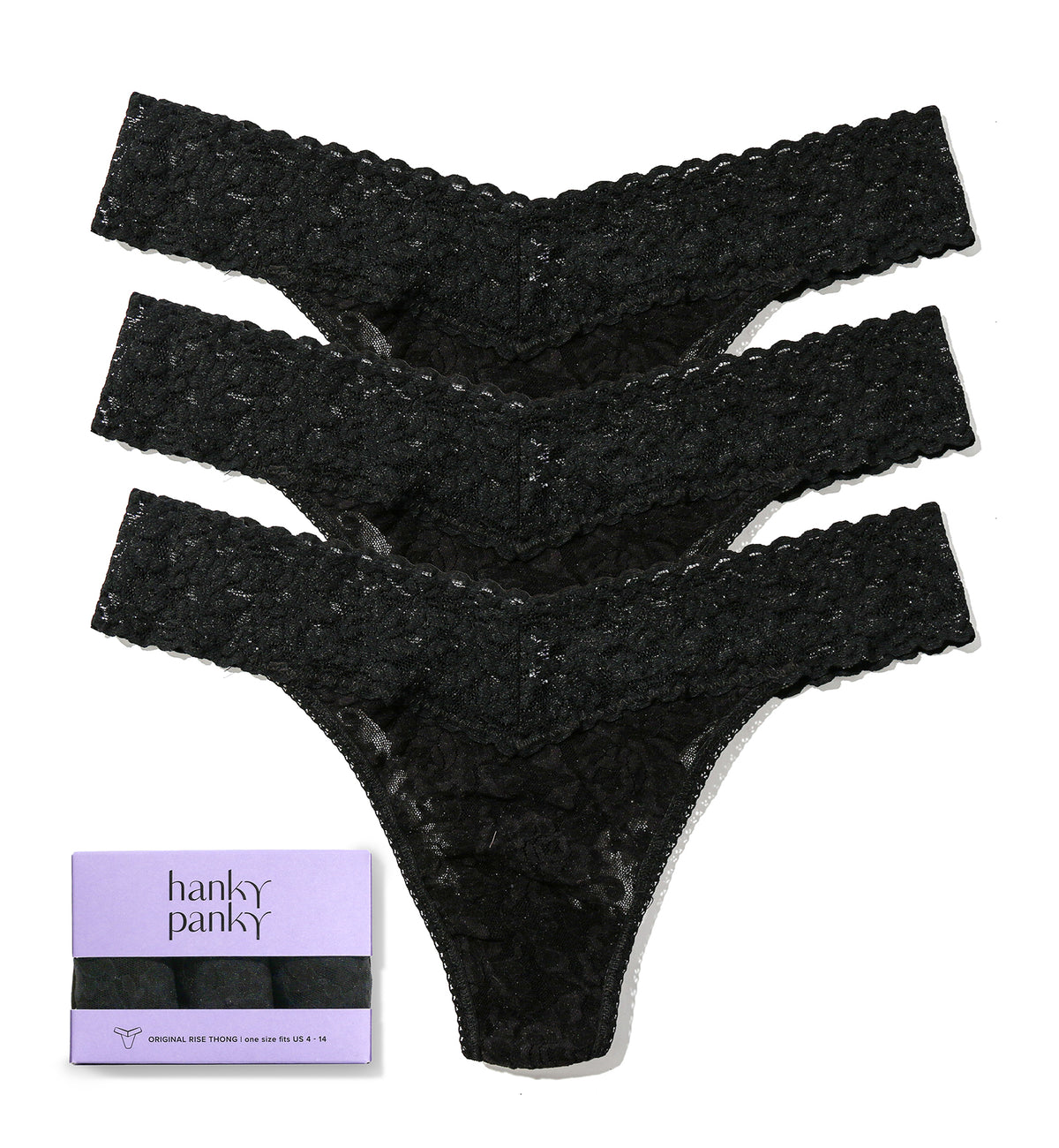 The Hanky Panky 3-PACK Signature Lace Original Rise Thong (48113PK) was created in NYC in 1986 and has been keeping people comfortable for decades with it's ultra-soft stretch lace. This thong underwear is made of Hanky Panky's comfy signature stretch lace with a semi-sheer design. The high rise waist sits well below the navel on most and is designed to fit US sizes 4-14. The back features cheeky thong rear coverage. The waistband is cut in the front and back in a V-shape for a super flattering cut that's always in style. Cute boxed set of three high rise thongs in comfy signature lace that Hanky Panky is famous for. Check out the Hanky Panky 3-PACK Signature Lace Low Rise Thong (49113PK) for a lower rise version of the same great panty, sold separately.