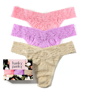 The Hanky Panky 3-PACK Signature Lace Original Rise Thong (48113PK) was created in NYC in 1986 and has been keeping people comfortable for decades with it's ultra-soft stretch lace. This thong underwear is made of Hanky Panky's comfy signature stretch lace with a semi-sheer design. The high rise waist sits well below the navel on most and is designed to fit US sizes 4-14. The back features cheeky thong rear coverage. The waistband is cut in the front and back in a V-shape for a super flattering cut that's always in style. Cute boxed set of three high rise thongs in comfy signature lace that Hanky Panky is famous for. Check out the Hanky Panky 3-PACK Signature Lace Low Rise Thong (49113PK) for a lower rise version of the same great panty, sold separately.