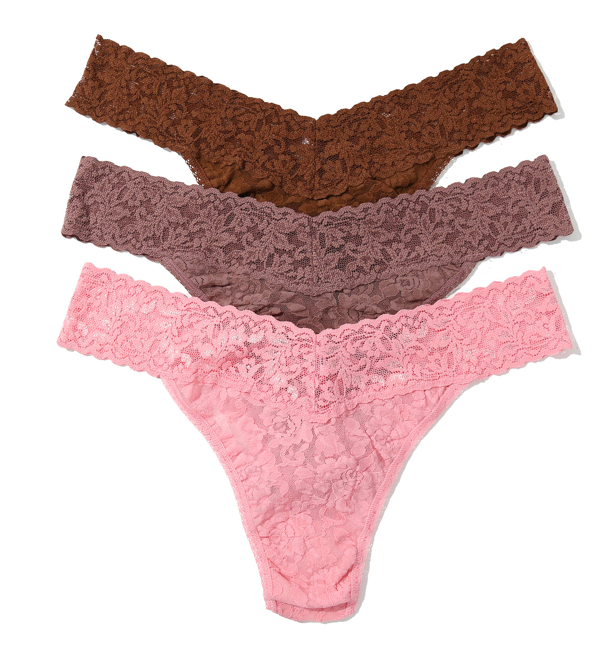 The Hanky Panky 3-PACK Signature Lace Original Rise Thong (48113PK) was created in NYC in 1986 and has been keeping people comfortable for decades with it's ultra-soft stretch lace. This thong underwear is made of Hanky Panky's comfy signature stretch lace with a semi-sheer design. The high rise waist sits well below the navel on most and is designed to fit US sizes 4-14. The back features cheeky thong rear coverage. The waistband is cut in the front and back in a V-shape for a super flattering cut that's always in style. Cute boxed set of three high rise thongs in comfy signature lace that Hanky Panky is famous for. Check out the Hanky Panky 3-PACK Signature Lace Low Rise Thong (49113PK) for a lower rise version of the same great panty, sold separately.