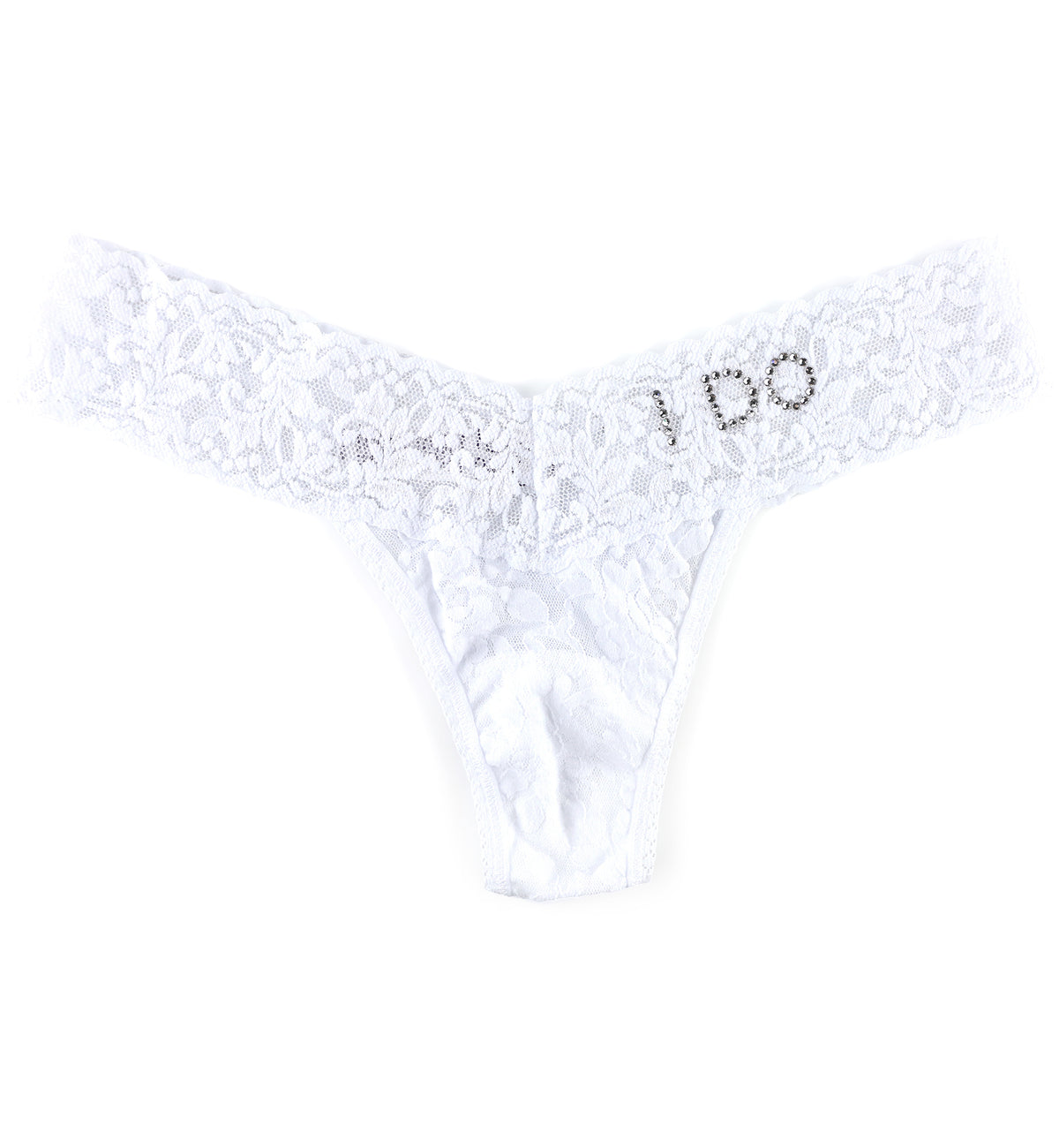Hanky Panky Bridal I DO Crystal Lace Low Rise Thong (6510) features Hanky Panky's comfy signature stretch lace. The cheeky, white thong sits low on the hips and has "I DO" written in all caps on your left hip, adorned in beautiful, sparkling clear rhinestones. Add some dazzle to your bridal lingerie on your wedding day while you say no to VPL under your dress!
