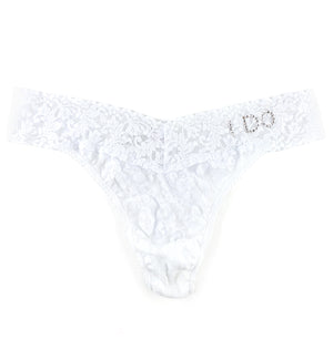 Hanky Panky Bridal I DO Crystal Lace Original Rise Thong (6511) features Hanky Panky's comfy signature stretch lace. The cheeky, white thong provides average coverage, sitting at or above the hips and has "I DO" written in all caps on your left hip, adorned in beautiful, sparkling clear rhinestones. Add some dazzle to your bridal lingerie on your wedding day while you say no to VPL under your dress!