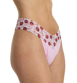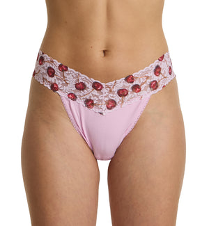 The Hanky Panky Original Rise Thong, now in cotton-spandex blend, features a flattering V-front and V-back design. The flexible lace stays in place without digging in, making this panty a sexy and comfortable thong for daily wear. With a printed waistband and solid body, this stretchy thong adds a comfortable, cute new look to your at-home wardrobe.
