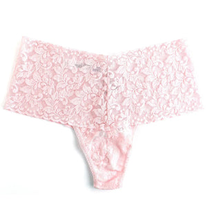 The Hanky Panky Retro Lace Thong (9K1926P) is an ultra comfortable thong with an extra-generous waistband designed to prevent digging in. This panty comes in one-size and fits sizes 0-12 best (hips measuring 34"-42"). The beautiful high-waisted panty is made of Hanky Panky's semi sheer retro lace with a floral pattern and is cut to create a flattering v-shape in front and back. The back features sexy thong rear coverage. Check out the plus sized version of the same great thong Hanky Panky Plus Size Retro Lace Thong (9K1926X) that is designed to fit US sizes 14 through 24 (hips measuring 44"- 57"), sold separately.