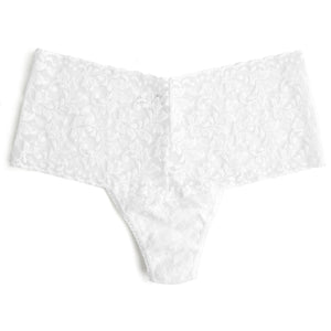 The Hanky Panky Retro Lace Thong (9K1926P) is an ultra comfortable thong with an extra-generous waistband designed to prevent digging in. This panty comes in one-size and fits sizes 0-12 best (hips measuring 34"-42"). The beautiful high-waisted panty is made of Hanky Panky's semi sheer retro lace with a floral pattern and is cut to create a flattering v-shape in front and back. The back features sexy thong rear coverage. Check out the plus sized version of the same great thong Hanky Panky Plus Size Retro Lace Thong (9K1926X) that is designed to fit US sizes 14 through 24 (hips measuring 44"- 57"), sold separately.