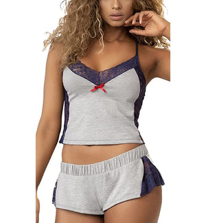 The Mapale 2 Piece PJ Set: Sheer Side Racerback Top & Flutter Short (7403) takes a comfortably cute pj set and adds semi-sheer lace details for a hunt of sultry sexiness. The camisole top has racerback styling and soft gray fabric with a V-neck lined with lace, with lace panels down the sides that show just a hint of skin. The shorts have cheeky rear coverage and a peekaboo lace detail.