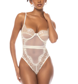 The Mapale Kimora Underwire Bodysuit (8835) blends feminine embroidery with delicate eyelash lace in a single piece of lingerie you're sure to love. This semi-sheer bodysuit features adjustable shoulder straps, removable waist tie, underwire support and cheeky rear coverage. You will look timeless in this sensual embroidered lace bodysuit. Pair with a pair of Mapale Mesh & Lace Thigh High Stockings (1094) for a sexy lingerie set, sold separately.