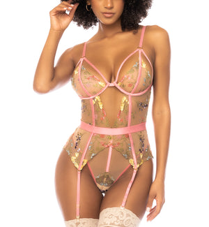 The Mapale Sydney Underwire Bodysuit (8821) blends feminine floral embroidery with sexy sheerness in a single piece of lingerie you're sure to love. This semi-sheer bodysuit features adjustable shoulder straps, underwire support and cheeky rear coverage. You will look like a rose garden dream in this delicate embroidered lace bodysuit with pink accents. Coordinate with a pair of Mapale Mesh & Lace Thigh High Stockings (1094) for a sexy lingerie set, sold separately.