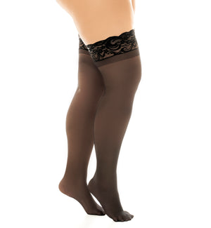 The Mapale Zoe Sheer Thigh Highs PLUS (1108X) is a transparent and lightweight thigh high stocking featuring lace tops lined with stay-up silicone lace that keeps these comfortably in place. The wide thigh band is a sturdy floral lace with concealed grips that stay in place worn solo, or can be paired with garters (sold separately) for the full lingerie effect! For a less sheer look, check out the Mapale Sassy Faux Leather Full-Footed Thigh Highs PLUS (1017X), sold separately.