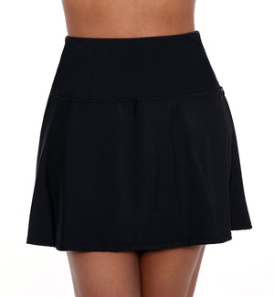 The Miraclesuit Fit Flare Swim Skirt (6516611) is constructed to skim your curves and hug your silhouette in confidence. This high rise swim skirt sits at the navel and upper thigh on most, making it perfect for pool-to-poolside transitions. This swim skirt is comfortably loose around your thighs with its flare bottom. The built-in swim brief and full coverage rear make this swim skirt a must-have addition to your swim wardrobe.