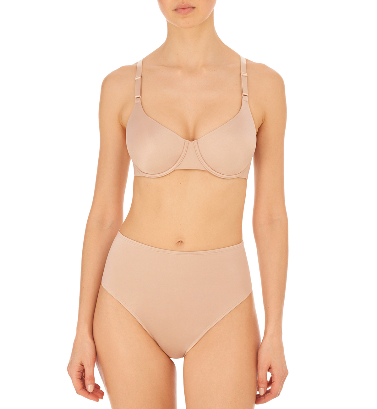 Natori Liquid Full Fit Contour Underwire Bra (731325) is a luxurious style with a sweetheart neckline that contours nicely to the top of the bust. This everyday t-shirt bra has molded seamless cups and a two-ply stretch band that is designed to have a smoothing effect and comfortably anchor in place without biting or digging. Fully adjustable straps are adjustable from front-to-back for an easier fix while you're wearing it. Pair this comfy daily wear t-shirt bra style with Natori Liquid High Rise Thong (771325), sold separately, for your favorite sleek and smooth lingerie set.