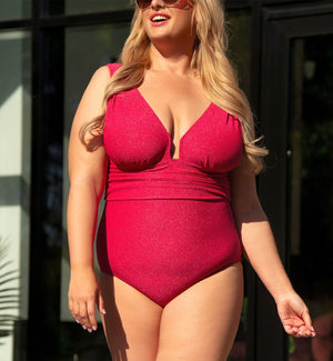 The Milano One Piece by Nessa has a very flattering fit for many different body and breast types. The red, pink, sparkly fabric will truly have you turning heads wherever you go. Despite its alpha sizing (S, M, L, etc.), it provides an excellent amount of bust support. For example, the XL suit can fit up to a UK J cup/US M cup very easily. It doesn't have an underwire in the cup, so the fit is quite flexible. There is a rectangle of wire in the center of the cup to keep it from flipping outward and to provide separation. You won't have to worry about wires poking you anywhere. I would recommend ordering your usual t-shirt size for this suit. If you have fuller hips or are taller, you can get a size up. Just remember that these suits are made for bustier women, so the further away you go from your shirt size, the bigger the bust area will be.