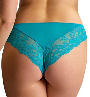 The Panache Ana Brazilian Panty (9392) hugs your body and curves with it's beautiful floral lace, making you feel sexy in this must-have brazilian brief. This panty features a lined front panel for modesty and semi-sheer hip and back panels in a sensual vintage lace. This panty sits low on the hips and has a cute accent bow on the waistband, making this panty feminine and sexy.