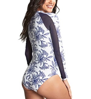 Panache Capri Grace Long Sleeve Nonwire Swimsuit (SW1725) is a one piece swimsuit with long sleeves that have stylish mesh panels on the front and back. This zip-front rashguard style swimsuit features a clean navy floral sketch print against a white background. This wireless swimsuit has a more relaxed fit and features removable pads for your lining preference. This sporty swimsuit features moderate rear coverage.