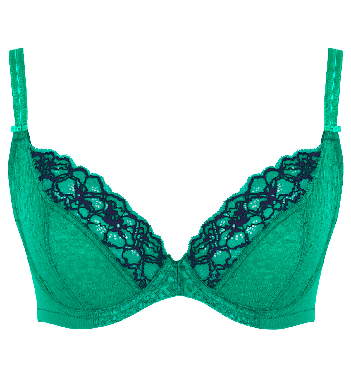The Panache Envy Plunge Underwire Bra (7286) is purrr-fect for a day at home or dressing up for a night on the town. This plunge bra blends leopard jacquard patterned fabric with a contrasting floral lace to keep you comfortable and lifted. The three piece plunge cup creates a flattering neckline that looks great under any top. The bottom cup is laminated for structure with an accommodating upper cup made from stretch lace to hug your natural silhouette. Pairs perfectly with the Panache Envy panty styles for a coordinating lingerie set, sold separately.