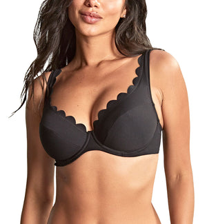 The Panache Spirit Lauren Plunge Underwire Bikini Top (SW1784) creates a timeless silhouette in a luxurious Spanish honeycomb textured fabric that epitomizes classic chic. The on-trend styling is finished off with a playful scalloped design along the neckline, for a feminine touch. This plunge swim top has ultra-deep plunge underwire cups with double-denier lining for ultimate support and boost to give you that WHOA cleavage. Check out Panache's other solid black swimwear pieces that coordinate perfectly, sold separately.