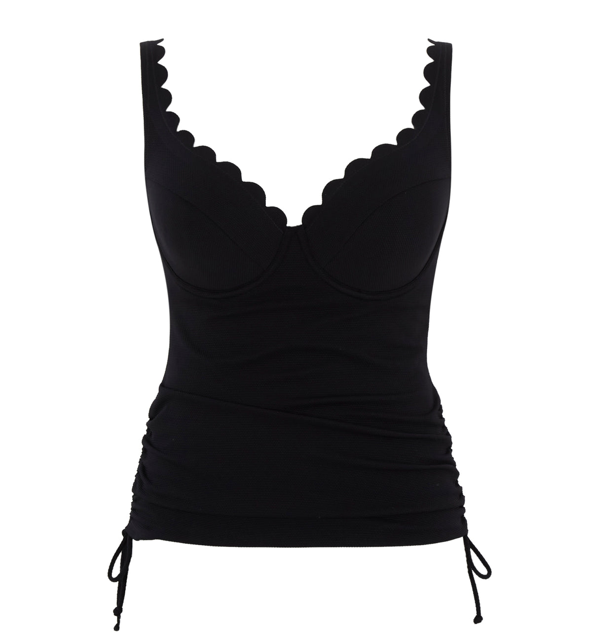 The Panache Spirit Selena Plunge Underwire Tankini (SW1781) creates a timeless silhouette in a luxurious Spanish honeycomb textured fabric that epitomizes classic chic. The on-trend styling is finished off with a playful scalloped design along the neckline, for a feminine touch. This versatile swim tankini has plunge underwire cups for definition and an uplifted, rounded shape. Adjustable straps and tie sides allow for a custom fit and the solid black colorway creates a figure-flattering look, perfect for fun in the sun. Check out the matching bottoms Panache Spirit Classic Swim Brief (SW1786) or Panache's solid black swim pieces, sold separately.