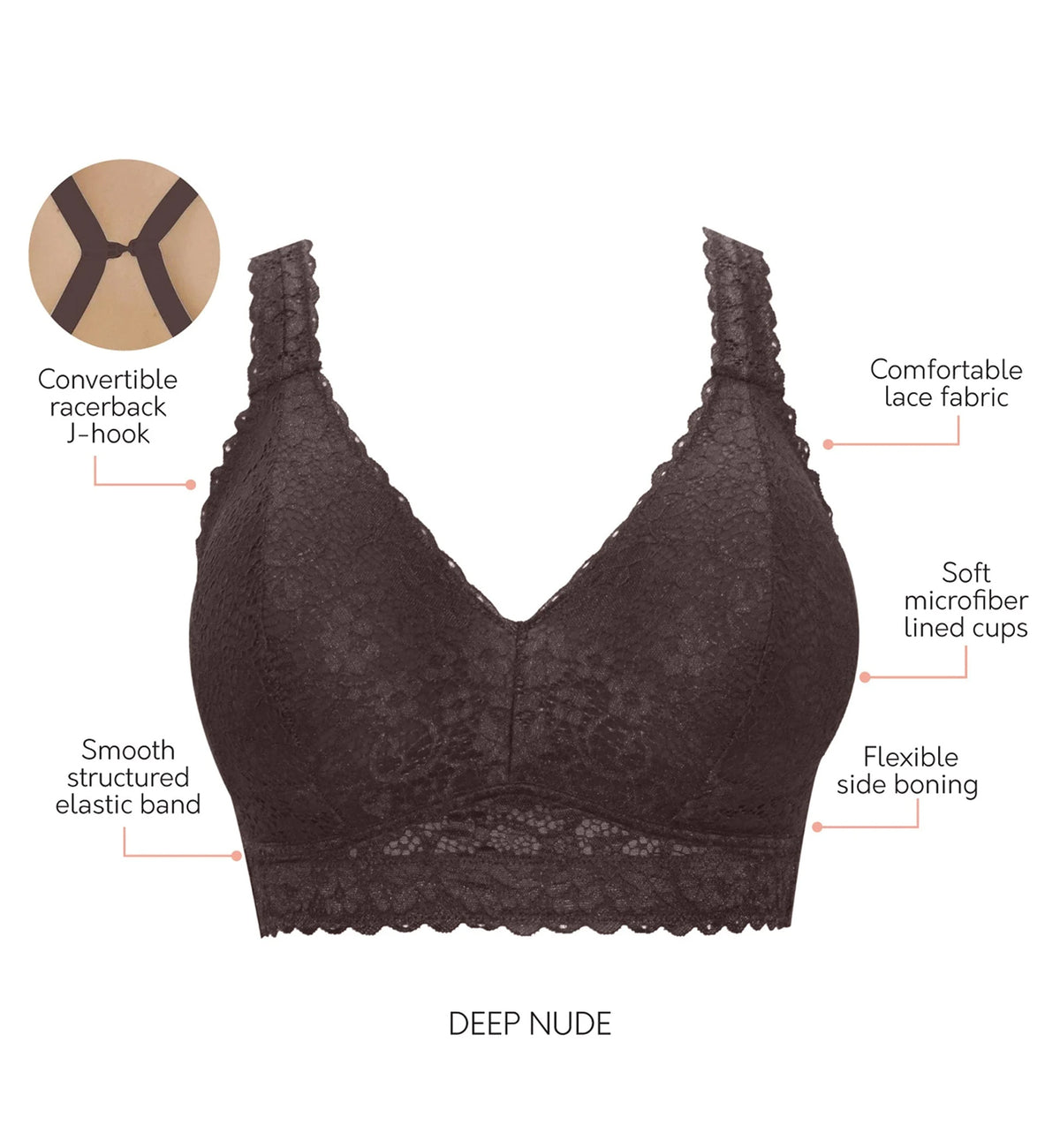 The Parfait Adriana Banded Stretch Lace Wireless Bralette 5482P is a new, updated take on a supportive bralette style. This gorgeously crafted lace bralette offers comfortable support with a structured band and adjustable shoulder straps and features a J-hook for racerback conversion.