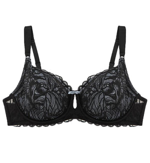 Add some serious sensuality to your wardrobe with the Parfait Charlotte Lace Unlined Underwire Bra (6922) in sultry black onyx with a textured lace look. The Charlotte offers three-part, molded, unlined cups that give supportive lift with a snug-fitting elastic underband. Close-set, adjustable straps put you in control of your perfect fit. Features keyhole detailing at center front and scalloped trim along the top cup, plus semi-sheer black lace layered over a lighter satin-feel base, for added visual interest.