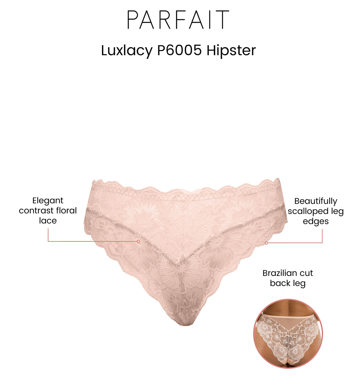 The Parfait Luxlacy Brazilian Brief (P6005) combines elegance and allure in this stunning panty. This Brazilian cut brief is adorned with sexy mesh, intricate floral lace and feminine scalloped edging. The rear offers cheeky brief coverage while the waist band is mid rise. The gusset is lined with 100% cotton. Pairs perfectly with the Parfait Luxlacy Unlined Plunge Underwire Bra (P6000) for a matching lingerie set, sold separately.