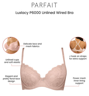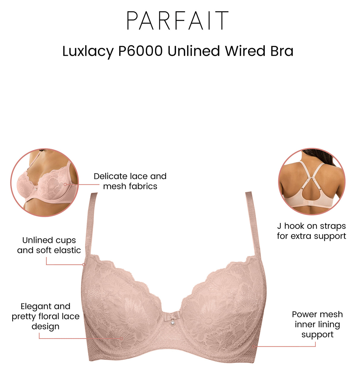 The Parfait Luxlacy Unlined Plunge Underwire Bra (P6000) combines elegance and allure in this stunning bra. This unlined, underwire bra features a low cut neckline that's perfect for most tops. Adjustable straps have a J-hook to convert to crossedback configuration for versatiliy. The beautiful details include sexy mesh, romantic floral lace and feminine scalloped neckline making this bra a must-have addition to your lingerie wardrobe. For a sophisticated matching lingerie set, check out the matching underwear style Parfait Luxlacy Brazilian Brief (P6005), sold separately.