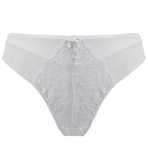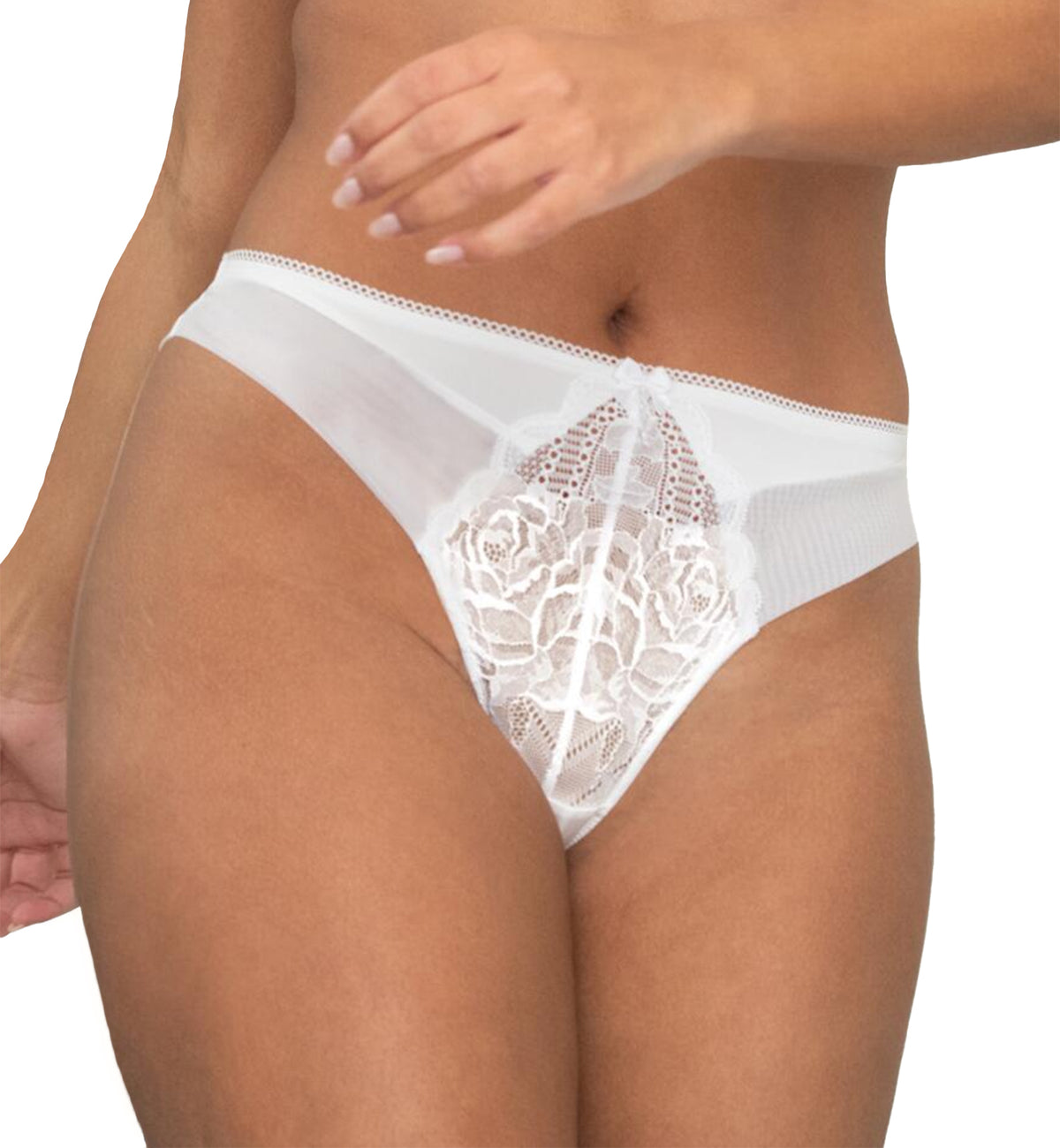 The Pour Moi Ooo La La Thong (28604) features an opulent lace panel in the front with beautiful scalloped edging. You will stay comfortable with the breathable mesh sides and back panels. The feminine bow jewel droplet on the elastic waistband matches with the Pour Moi Ooo La La Push Up Padded Bra (28607) perfectly, sold separately.