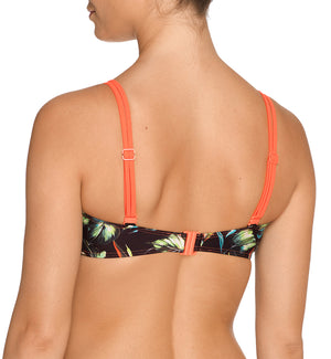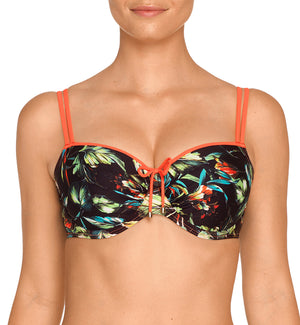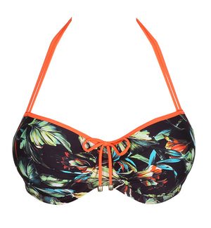 The Prima Donna Biloba Padded Balcony Underwire Bikini Top 400-4116 features an updated, vibrant tropical jungle print layered on a solid dark foundation with contrasting trim for a bright pop of color. The adjustable, convertible straps can be worn over-the-shoulder or halter style for multiple looks in one swim top. Lightly padded, balcony cups and underwire shaping make this top a must-have addition to your swim wardrobe.
