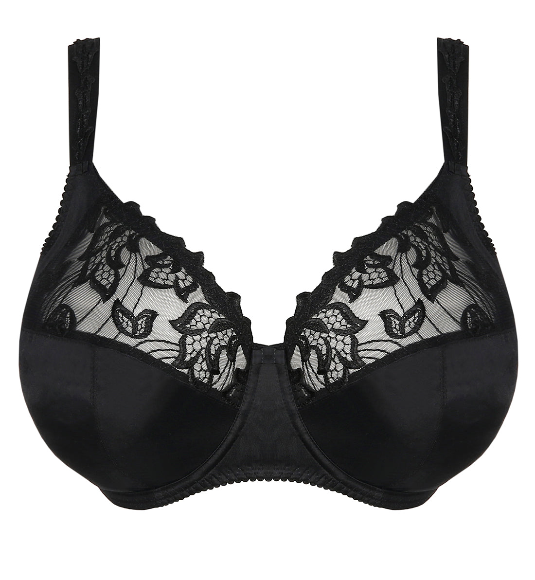 The Prima Donna Deauville Full Cup Underwire Bra (0161815) features elegant leaf-pattern embroidery over sheer mesh on the top cup, with a new design to suit larger cup sizes. This underwire bra delivers a gorgeous, supportive, and comfortable full-figured fit. The three-part cups fit perfectly with the stretch lace tops and elastic sides, while the side support panels provide extra support and push forward. The stunning embroidery continues up the adjustable straps for a truly sophisticated look. Despite its lacy, flirty appearance, this full-figured underwire bra has a strong and supportive build that remains comfortable for all-day wear.