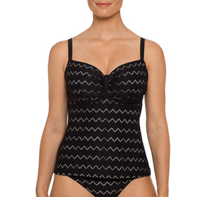 The Prima Donna Maya Padded Tankini Top 400-4370 blends tankini style and coverage with a trendy chevron crochet pattern in classic black. Lightly padded, underwire cups provide shaping and support. The straps are covered with line textured fabric to keep the adjustment in place. Wear the convertible straps over the shoulder or halter-style around the neck. Center front gathering defines and separates with plenty of uplift. Tankini coverage is designed to hit the upper hip.