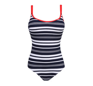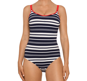 The Prima Donna Pondicherry Padded One Piece Swimsuit 400-3838 is a trendy triangle swimsuit with lightly padded non-wire cups, full rear coverage, and fully adjustable straps. This classic nautical design features rich navy and crisp white stripes with pops of red trim along the neckline, straps, and back. Youthful and retro-inspired, this nautical design with dot-textured fabric will turn heads.